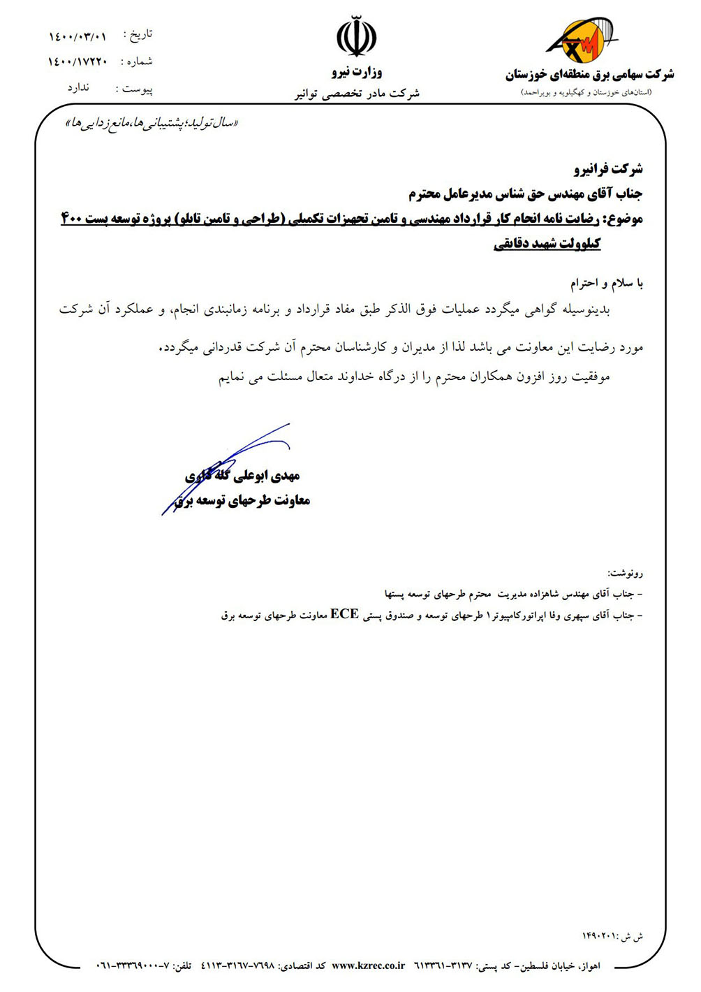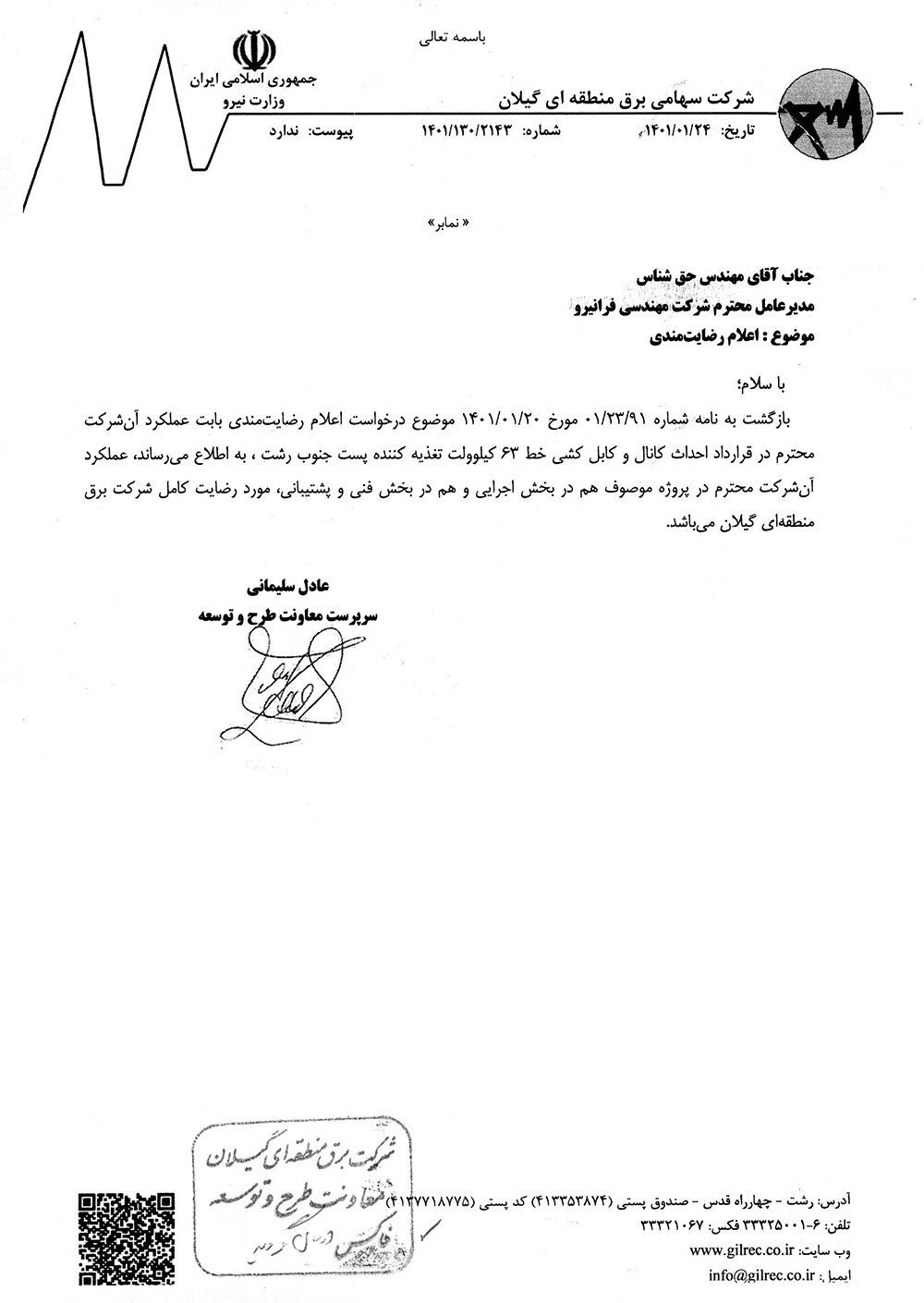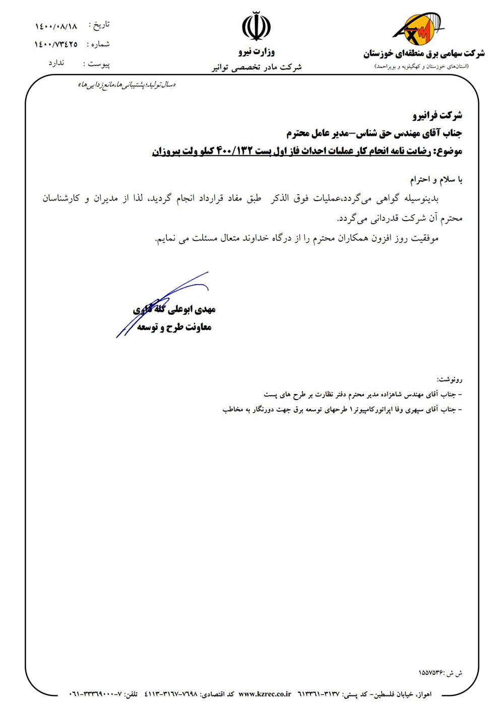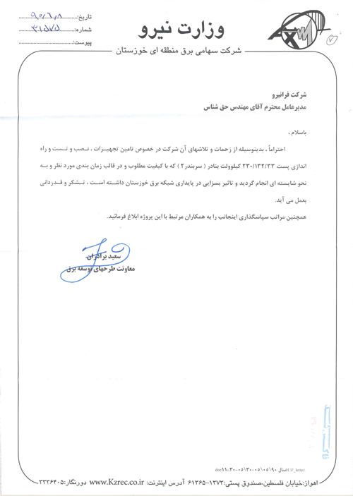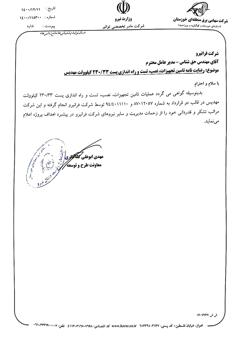 اعلام رضایت مندی بابت عملکرد شرکت مهندسی فرانیرو در قرارداد احداث کانال و کابل کشی خط 63 کیلوولت تغذیه کننده پست جنوب رشت