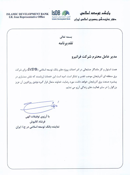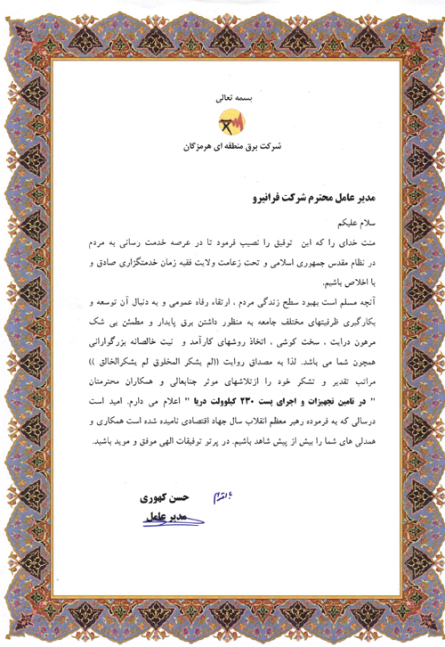 تقدیر از زحمات مدیریت و سایر نیروهای شرکت مهندسی فرانیرو جهت احداث پست 230/33 کیلوولت مهدیس