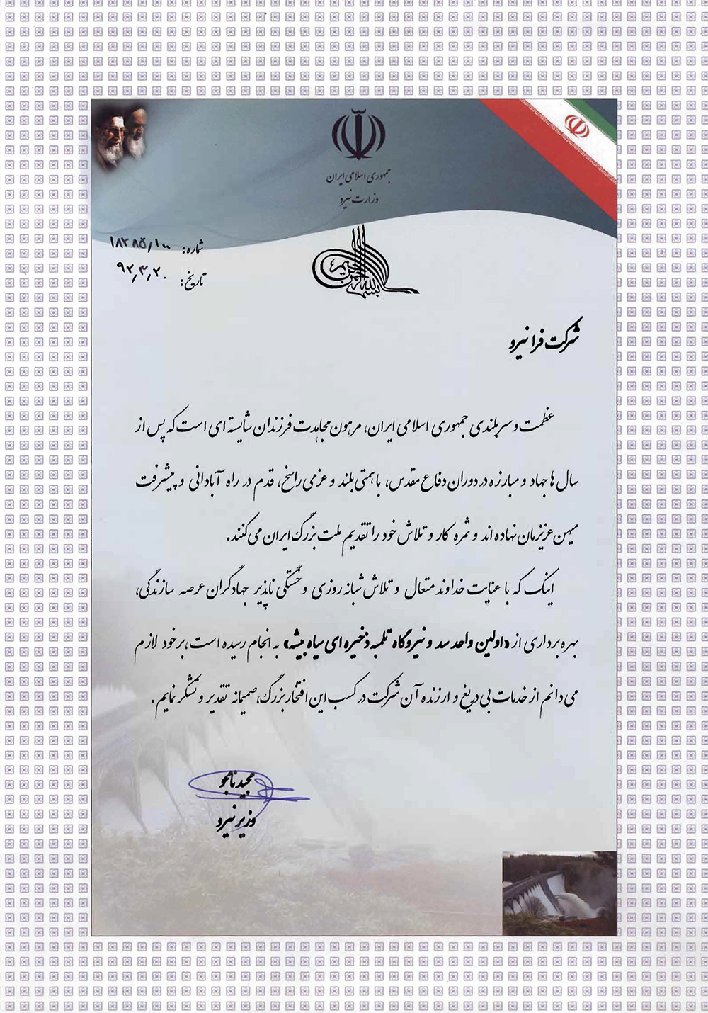 قدرداني وزير محترم نيرو از شركت مهندسي فرانيرو